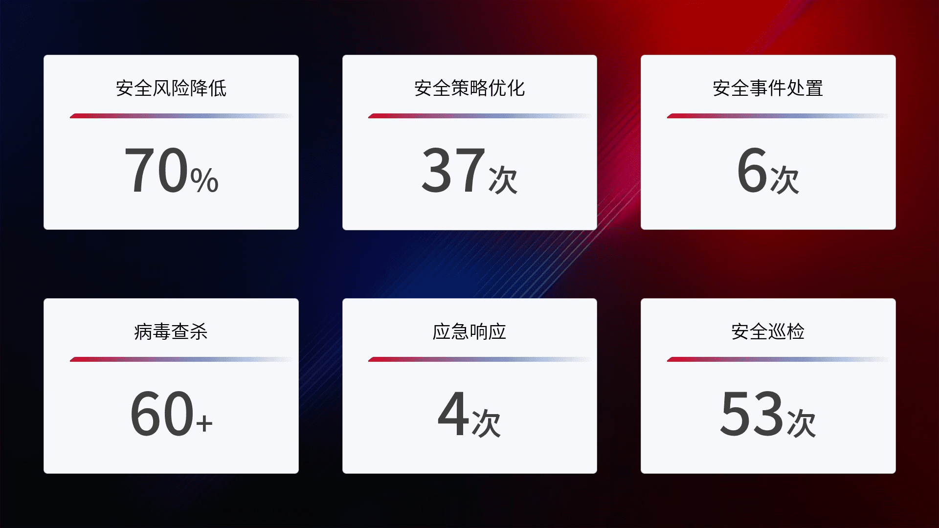 提供全面的安全事件报告体系,,,,包括处置报告、、、周报、、、季度和年度总结,,结合持续监控,,,,帮助客户深入了解网络安全状况。。